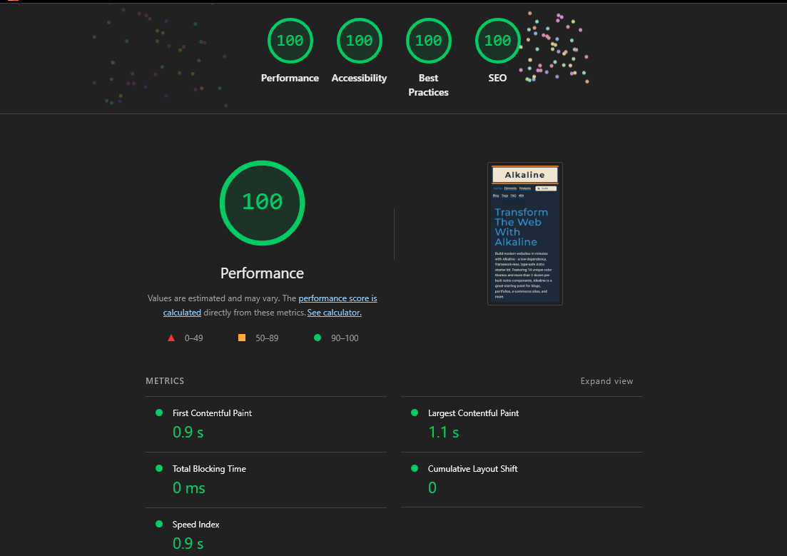 I built Alkaline to be the theme I wished existed when I first started in web development: Simple to set up, easy to customize, yet powerful enough to grow with any project. Out of the box, it scores a perfect 100 on Lighthouse, giving you performance and accessibility without extra effort. Whether you’re building your first blog, a polished documentation site, your portfolio, or even a complex e-commerce site, Alkaline makes it effortless to launch something fast, flexible, and professional.