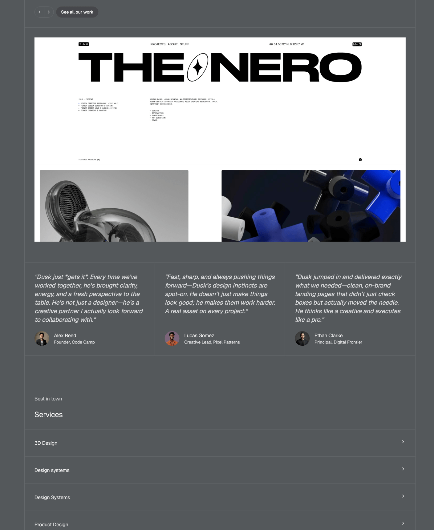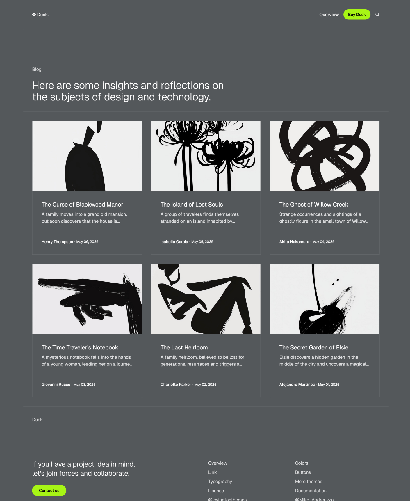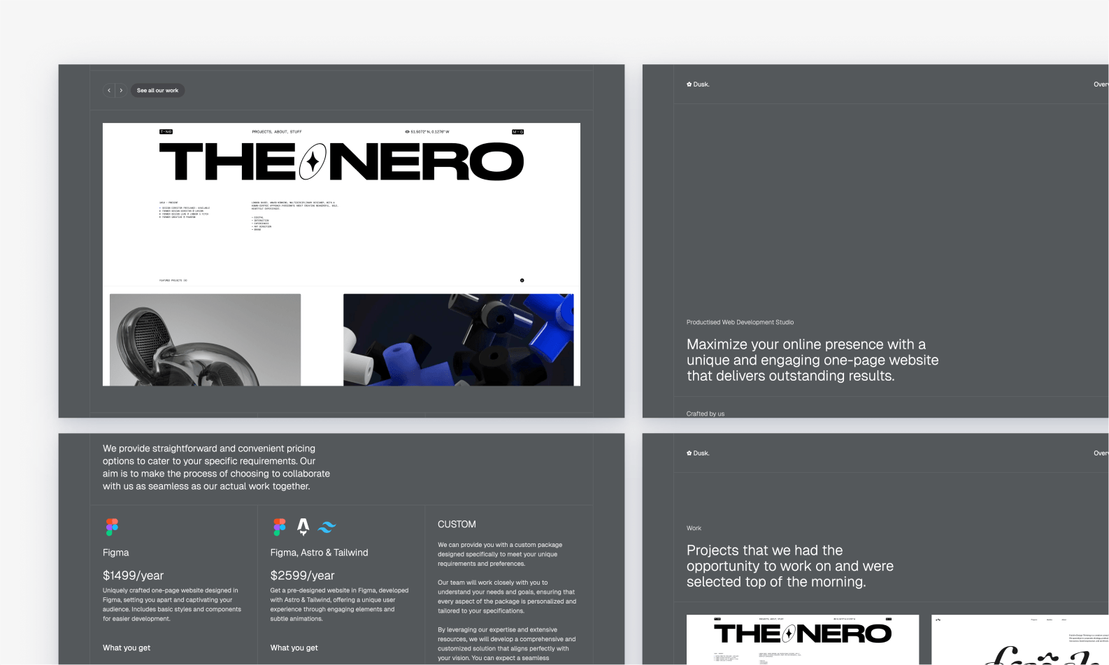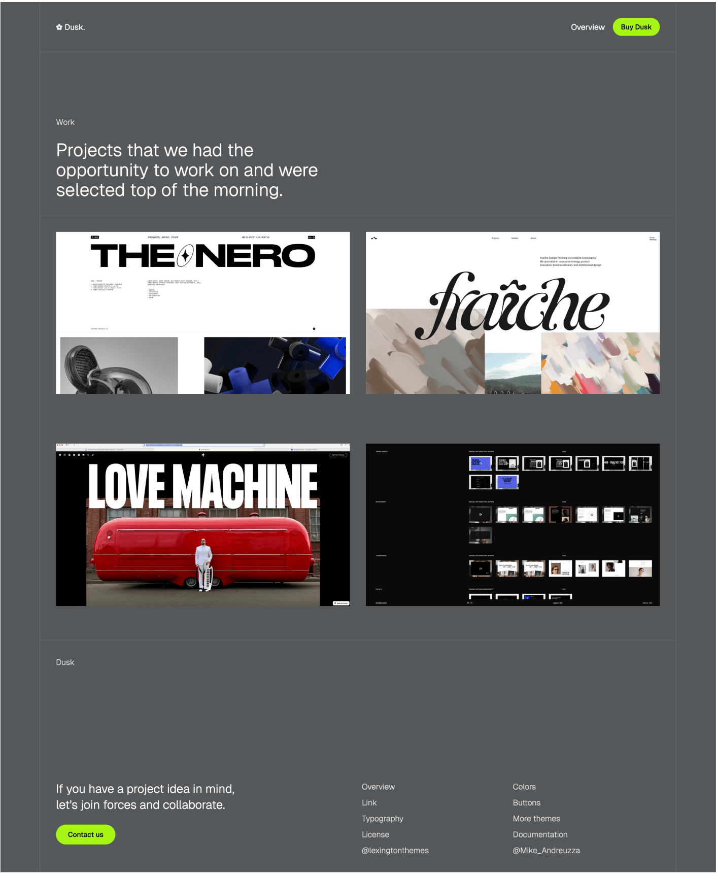 Dusk is a dark, minimal agency theme with a strict grid and electric yellow highlights. Designed for studios that want clarity, precision, and presence—without the noise.