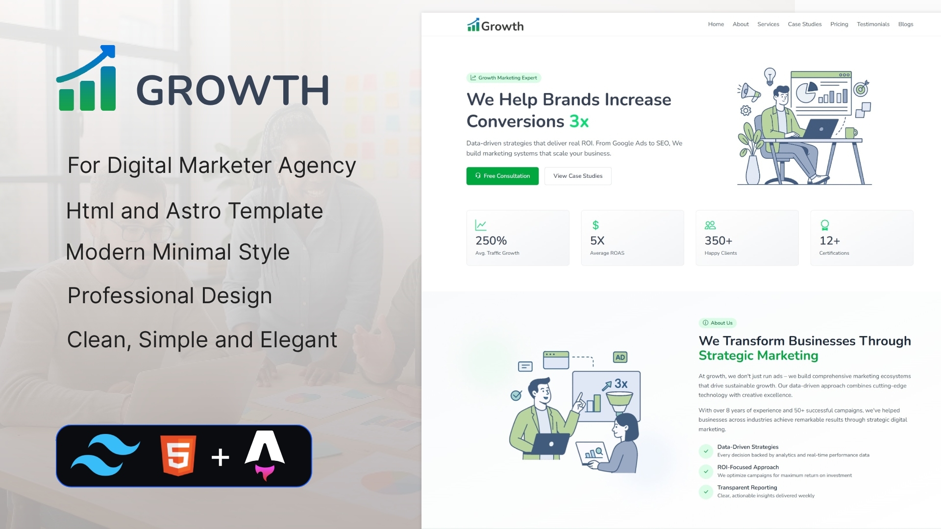 Growth is a professional Digital Marketing Landingpage Web Template built with Tailwind CSS, Alpine.js, and Astro Build β perfect for agencies, SEO specialists, and creative marketing teams that want to convert visitors into clients.