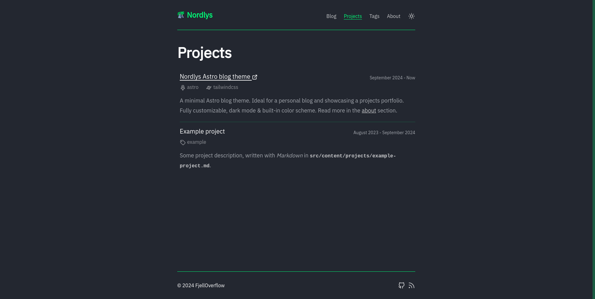 Nordlys is a minimal blog theme, ideal for a personal blog and showcasing a projects portfolio. It is fully customizable and easily configurable, includes built-in color themes, code blocks with custom headers and a dark & light mode. Simple, but elegant, it looks good both on mobile and desktop and it is quick to take into use and so you can immediately start writing content.