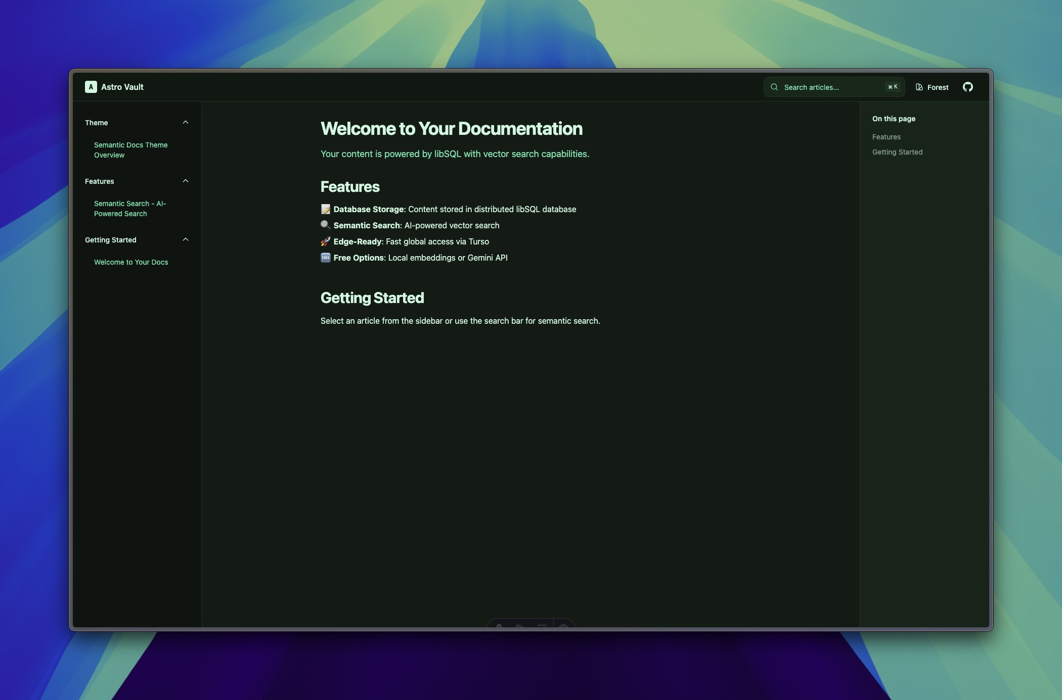 Semantic-docs is a modern documentation theme built with Astro that combines the speed of static site generation with powerful semantic vector search capabilities.