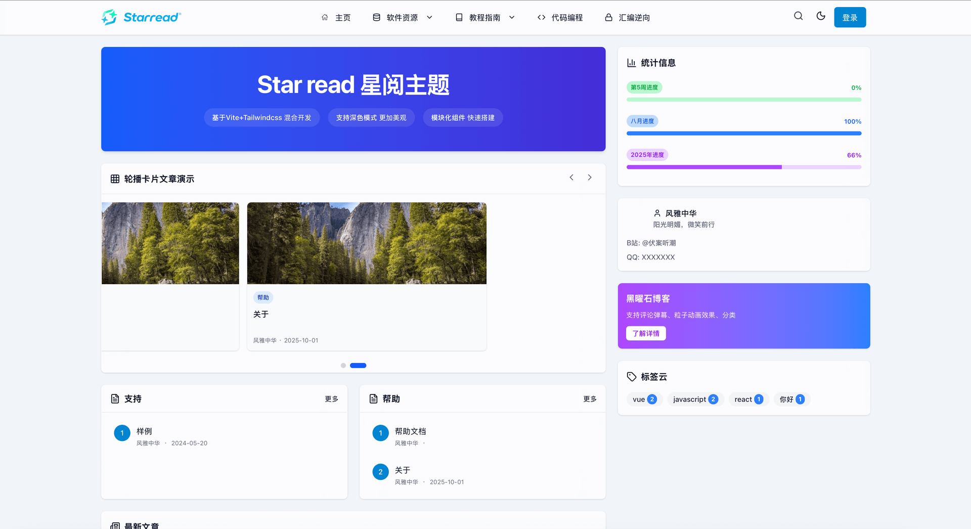 You can customize theme configuration by modifying the <code style="background-color: rgb(255, 255, 255); color: rgb(50, 50, 50);">starread.config.ts</code> file in the root directory, including website title, navigation menu, author information, sidebar component display, etc.