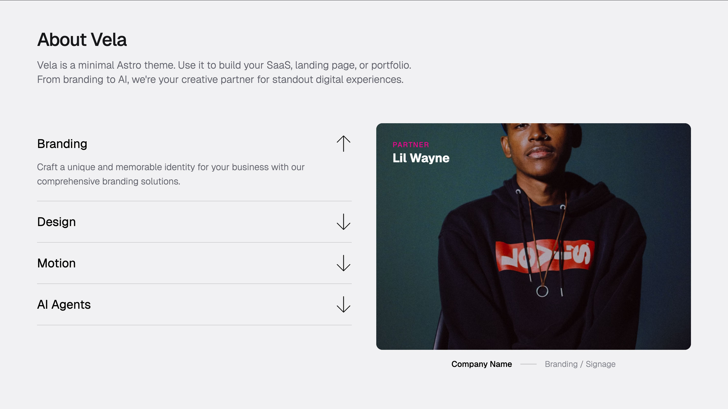 Vela is a minimal landing page theme. SEO optimised, tailwind ready, perfect for landing page, portfolio, agency.